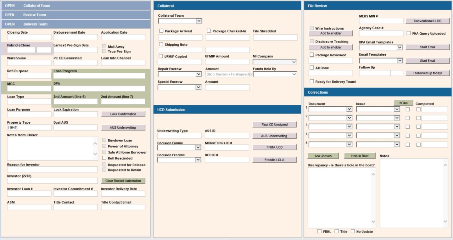 • The correction section on the review team panel houses the majority of reportable data for the Department. When a loan is reviewed, the Shippers will log the issues in a document + issue format and include additional details in the notes box below. Each month, the data from these fields is pulled, analyzed, and brought to operations managers as a way of showcasing common issues that made it past Closing a loan.